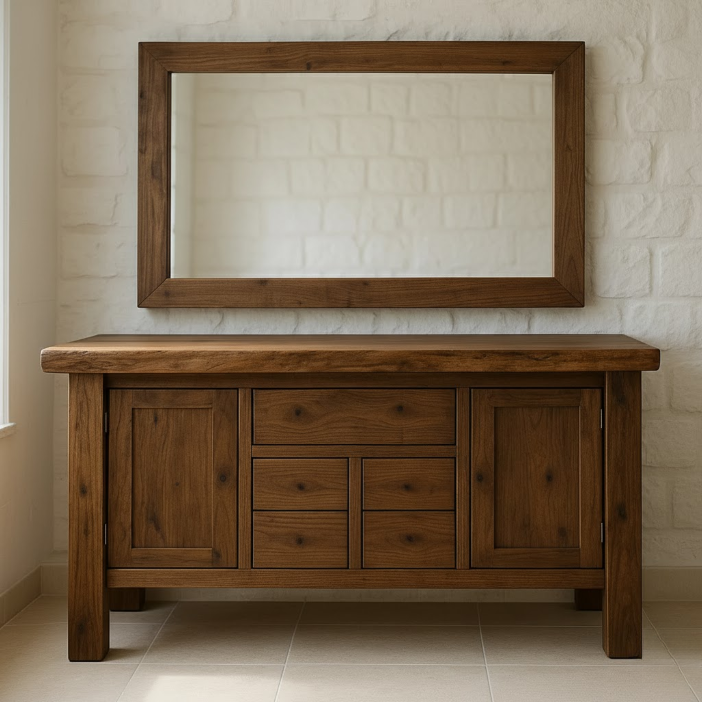 Introducing our magnificent Handcrafted Solid Wood Bathroom Vanity, featuring a sophisticated live-edge countertop, two side cabinets, and a central column of five drawers, offering maximum organized storage beneath a sleek vessel sink. This stunning console is expertly handcrafted and available for full customization in dimensions, wood species, and finish, allowing you to perfectly tailor this robust and stylish piece to your unique bathroom design.