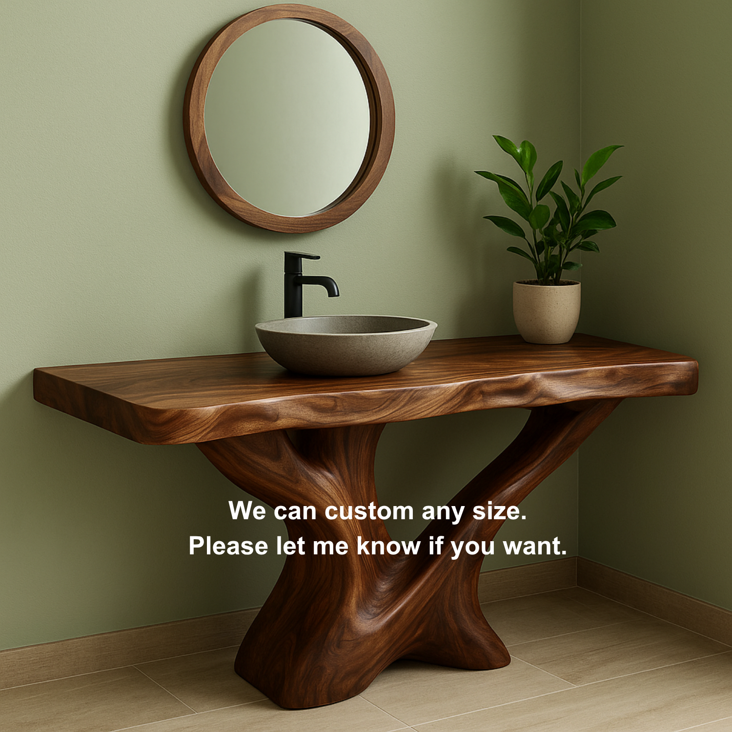 Handcrafted from solid wood, this sculptural vanity features a smooth root-inspired base and live-edge top. A perfect harmony of organic beauty and modern craftsmanship for serene bathrooms.