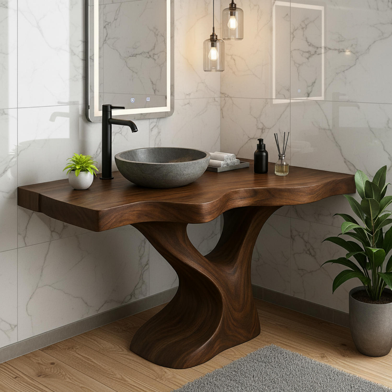 Handcrafted from solid wood, this sculptural bathroom vanity features a flowing twist base and natural curves. A blend of art, nature, and modern craftsmanship for serene and luxurious interiors.