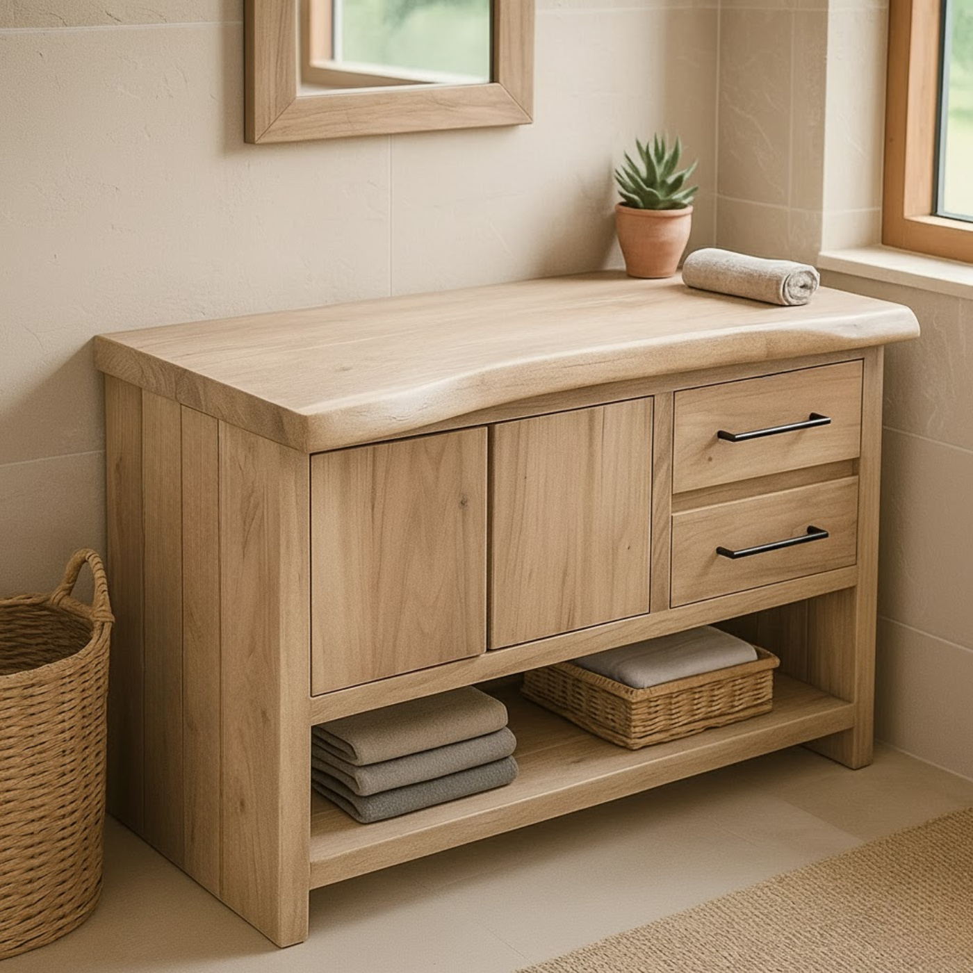 Handcrafted Solid Wood Bathroom Vanity with Live Edge Maple Top and Storage Shelves