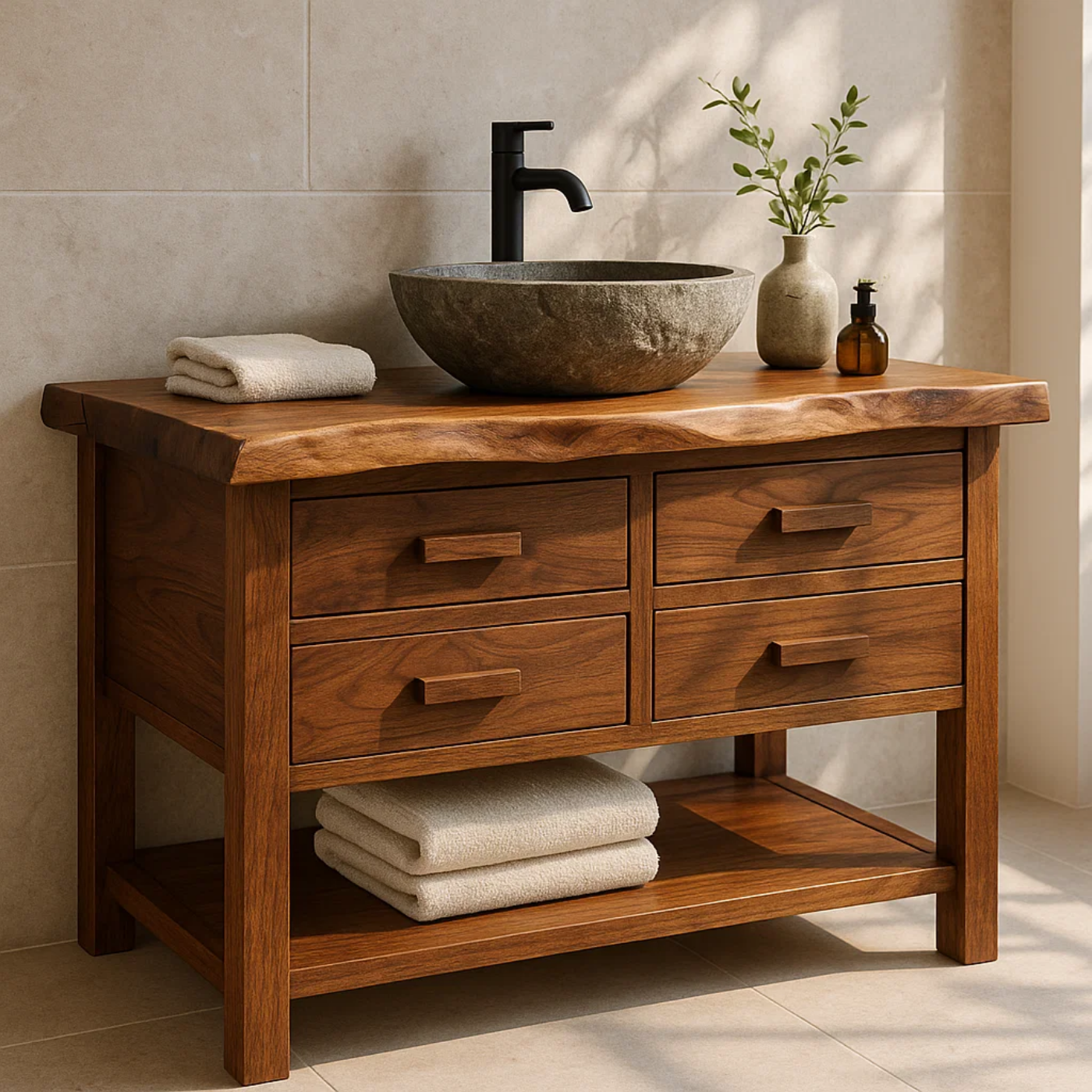 Handcrafted Solid Wood Bathroom Vanity with Live Edge Top and 4 Drawers
