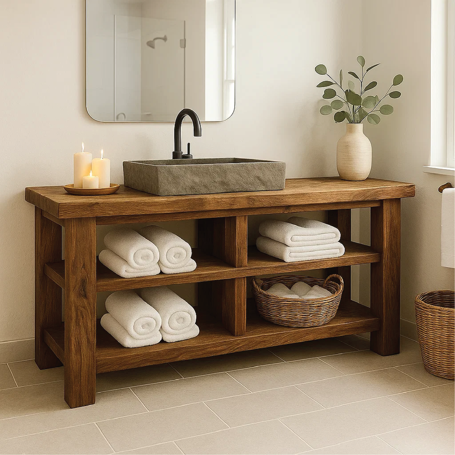 Handcrafted Solid Wood Bathroom Vanity with Open Shelving for Natural and Minimalist Interiors