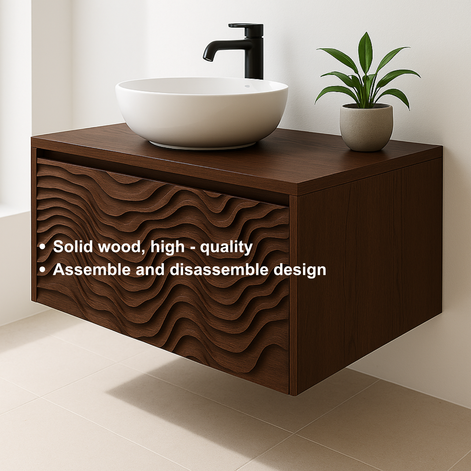 Inspired by the movement of water, this handcrafted solid wood floating vanity showcases a layered wave pattern carved by hand, creating a captivating sense of flow and dimension.