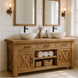 This charming Handcrafted Solid Wood Double Bathroom Vanity is the ultimate Farmhouse centerpiece for a shared bathroom. It provides exceptional storage with two X-door cabinets, three drawers, and a central open shelf for easy-access towels. This robust piece is built from solid wood, offering enduring quality and a warm, inviting aesthetic.