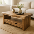 This handcrafted solid wood coffee table showcases organic beauty with a natural edge top and warm wood tones. Featuring two sleek drawers and an open shelf, it offers smart storage for your essentials. A timeless piece that adds rustic charm and refined simplicity to any living space.