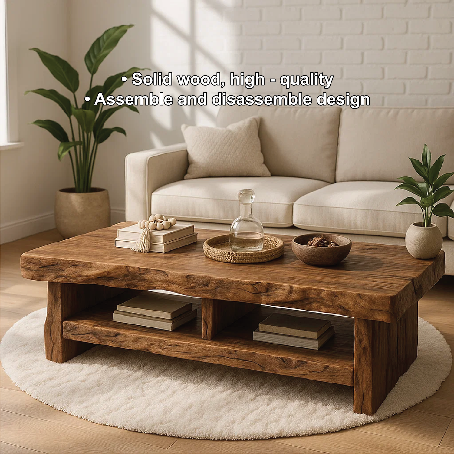 This handcrafted coffee table is made from solid wood, showcasing a stunning live-edge top with rich natural grain. The double-shelf design offers practical storage while maintaining a clean, minimalist look. Perfect for modern rustic interiors, it brings warmth, character, and timeless craftsmanship to your living room.