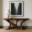 This handcrafted solid wood console table features a horizon-inspired sculptural base with smooth, flowing curves. Its organic form and refined craftsmanship create a perfect blend of art and functionality, adding a touch of timeless elegance to any modern living or entryway space.