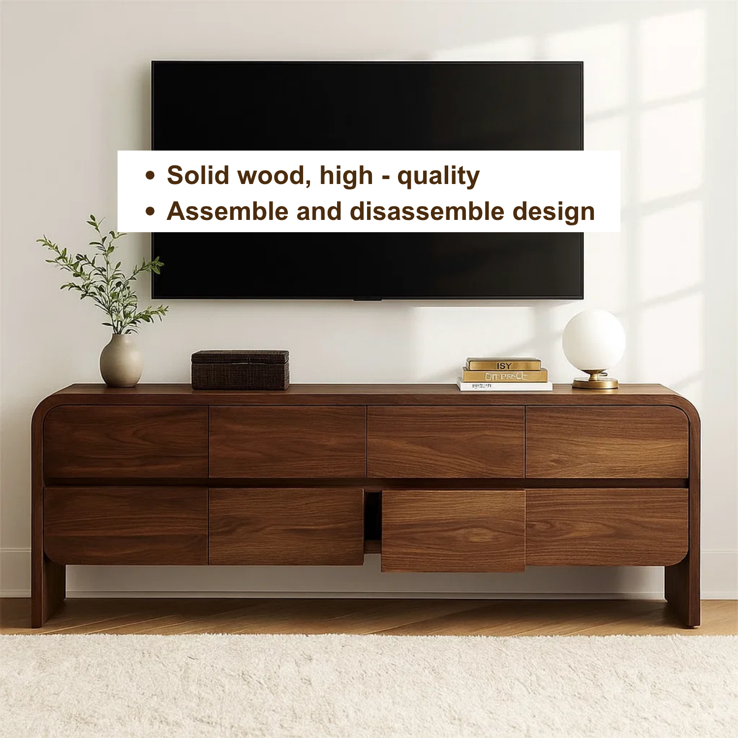 This handcrafted TV stand is made from premium solid walnut wood, featuring elegant curved edges and a sleek minimalist form. The seamless drawers offer ample hidden storage, keeping your space refined and clutter-free. Perfect for modern and contemporary interiors, it embodies timeless craftsmanship and natural sophistication.