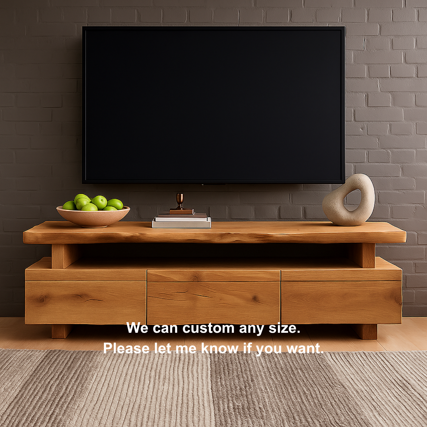 Handcrafted Solid Wood TV Stand – Modern Minimalist Media Console with Three Drawers and Natural Live Edge Design