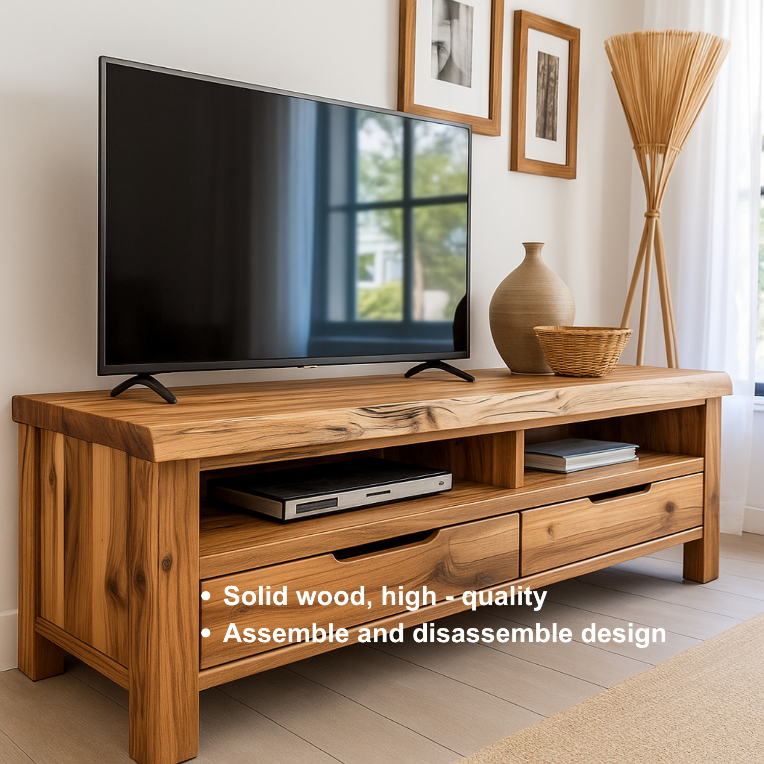 This handcrafted solid wood TV stand brings the beauty of natural craftsmanship into your home. Designed with a subtle live edge top and a warm natural wood finish, it exudes rustic charm and modern simplicity.