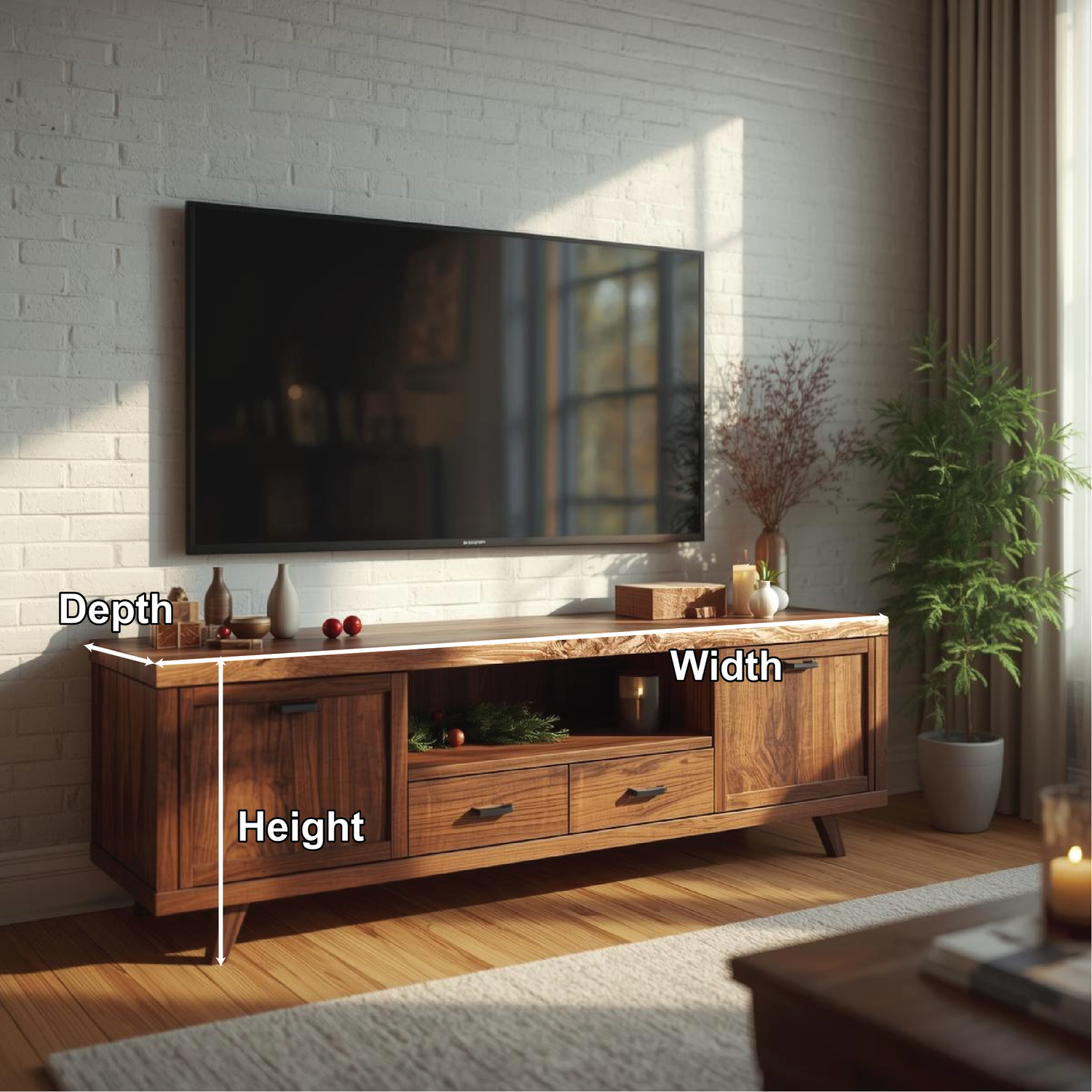 This handcrafted solid wood TV stand highlights a natural live edge top that brings organic beauty into your home. Featuring open shelves and deep drawers, it provides functional storage with a rustic modern aesthetic. Perfect for any living room, it combines timeless craftsmanship with natural elegance.