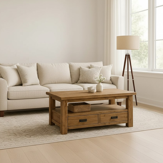 Handcrafted Solid Wood Coffee Table with Drawers – Rustic Natural Design for Modern Living Rooms