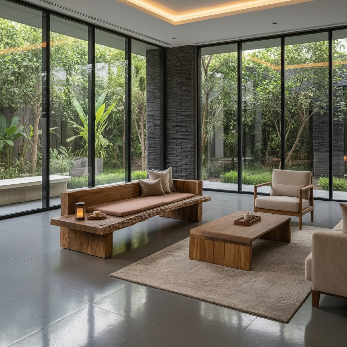 This handcrafted solid wood sofa features a striking live edge slab and a minimalist bench-style design. Its rich natural texture and warm tones bring organic beauty and rustic sophistication to any modern space.