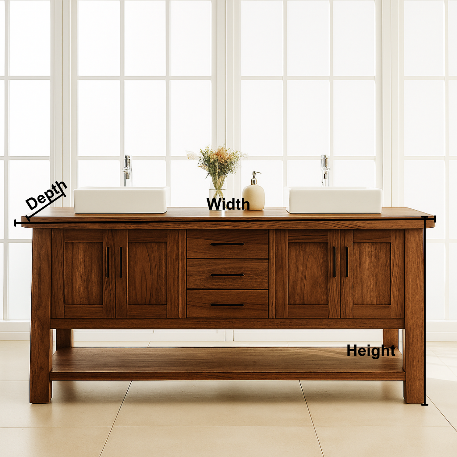 Handcrafted Solid Wood Double Bathroom Vanity – Modern Rustic Base with Center Drawers and Open Shelf