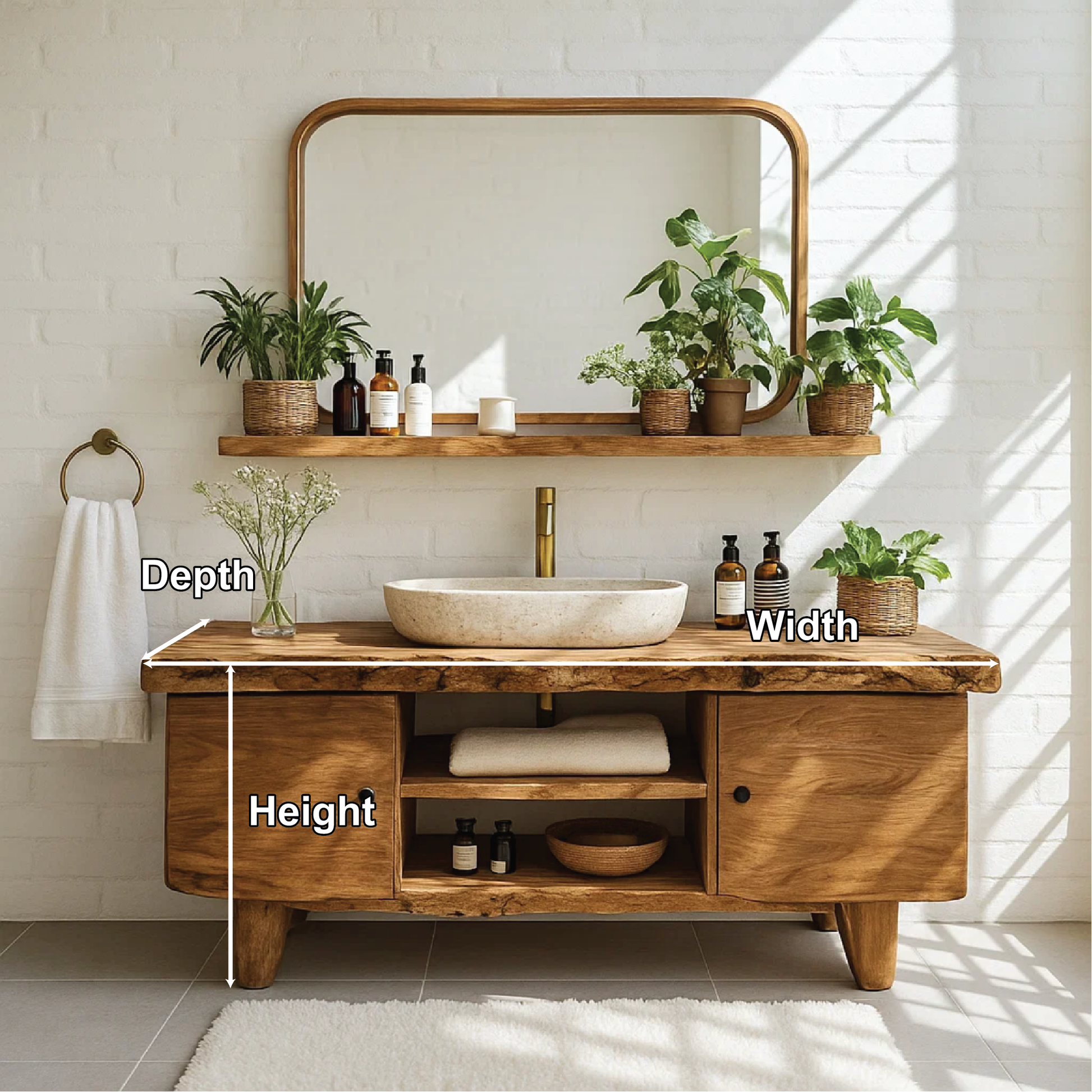 This handcrafted vanity is built from premium solid wood, highlighting organic grain and texture. Its design combines natural beauty with modern simplicity, offering both style and functionality. The sturdy construction and warm tone bring a sense of calm, artisanal elegance to your bathroom — sink not included.