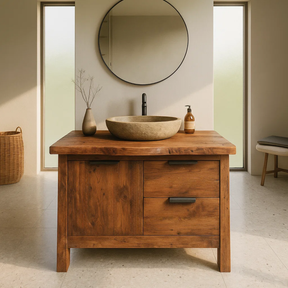This handcrafted wood bathroom vanity features a smooth live-edge top and elegant modern drawers for a warm, natural centerpiece in any bathroom. Built from premium solid wood with a matte finish, it offers both durability and refined style for contemporary interiors.