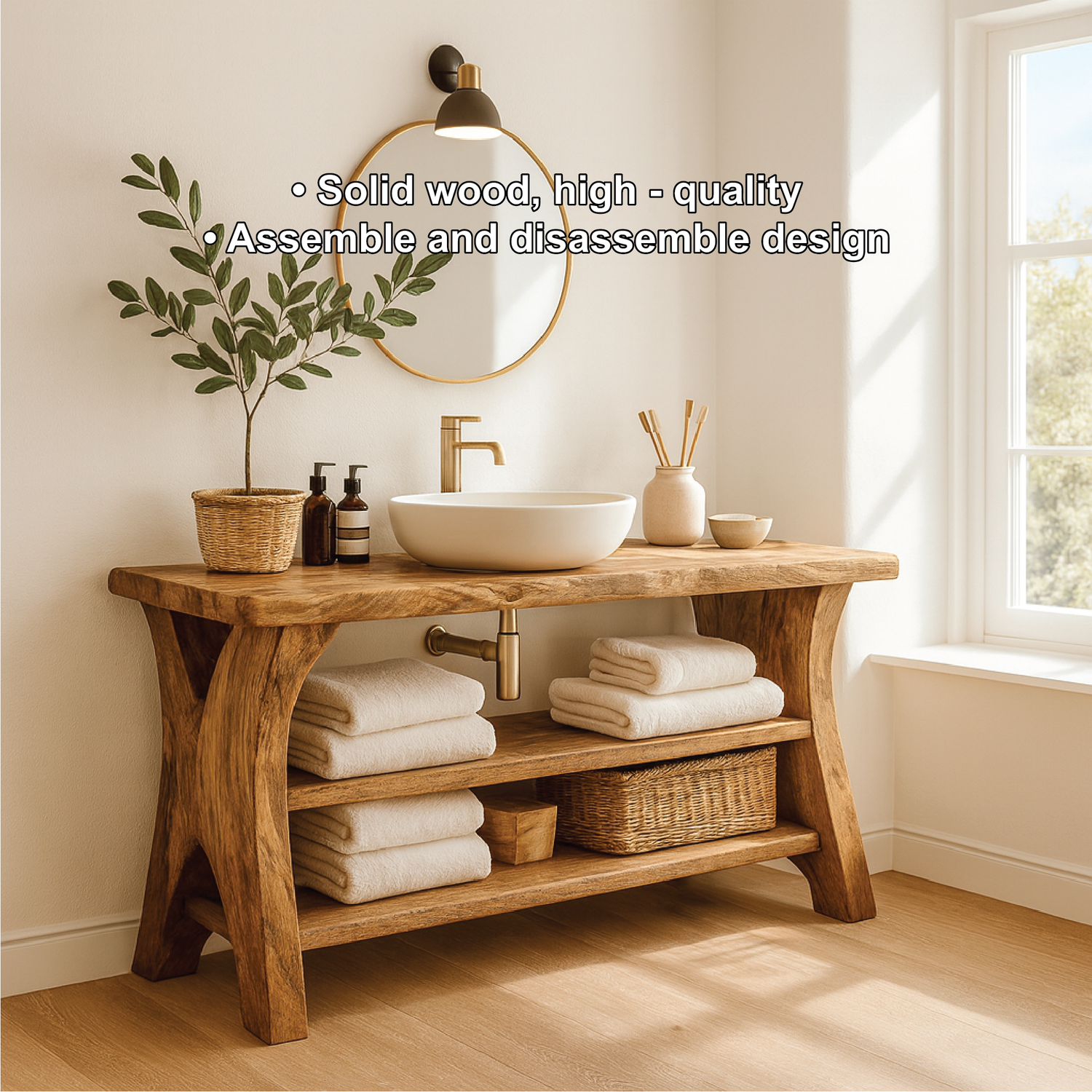 Handcrafted Solid Wood Bathroom Vanity with Natural Live Edge and Open Storage Shelf Design