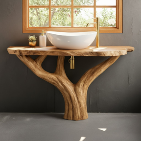 Make a breathtaking statement with this handcrafted solid wood bathroom vanity. featuring an organic live edge top supported by a stunningly sculpted tree root base, this console brings unparalleled natural artistry and luxury to your bathroom space.