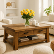 This handcrafted solid wood coffee table blends rustic warmth with modern functionality.