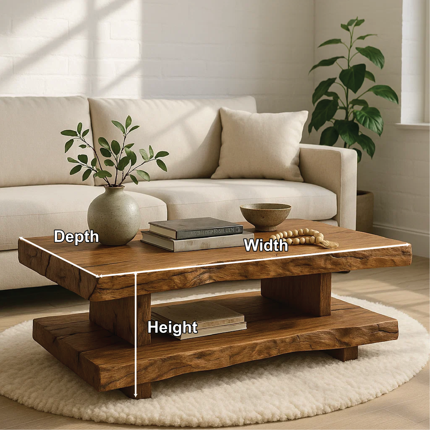 This solid wood coffee table is meticulously handcrafted, showcasing the raw beauty of nature through its live-edge surfaces. The double-shelf design offers both visual balance and practical storage. Perfect for modern rustic or Japandi interiors, it adds warmth, texture, and artisan craftsmanship to your living space.