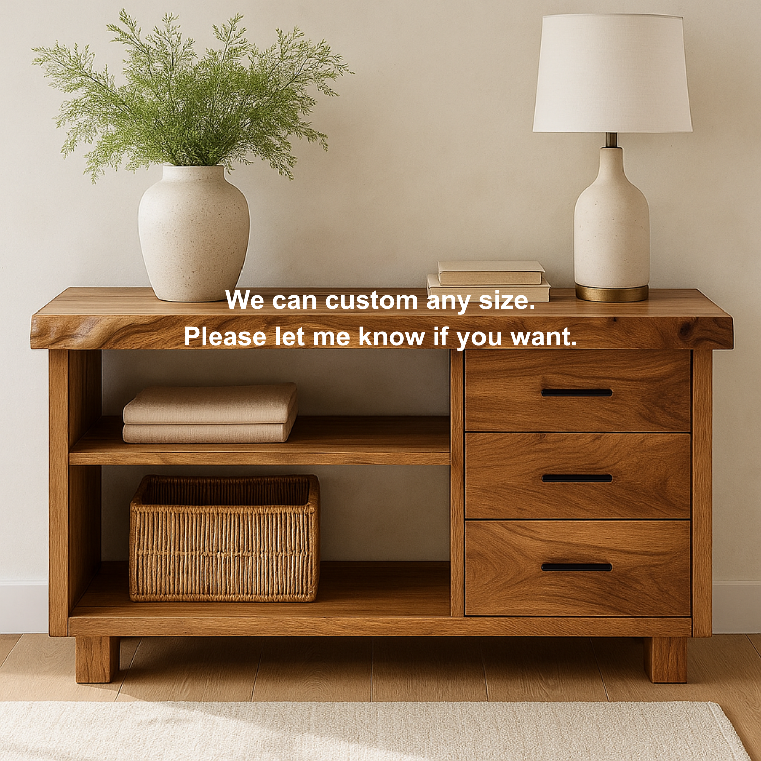 Each furniture is handcrafted, making them one-of-a-kind, with slight variations in color and wood grain adding to the charm. Size, leg height, or color tone can be customized upon request.