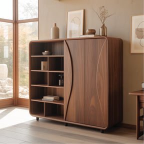 Handcrafted Solid Wood Dining Cabinet with Open Shelves and Curved Door Design for Modern Homes