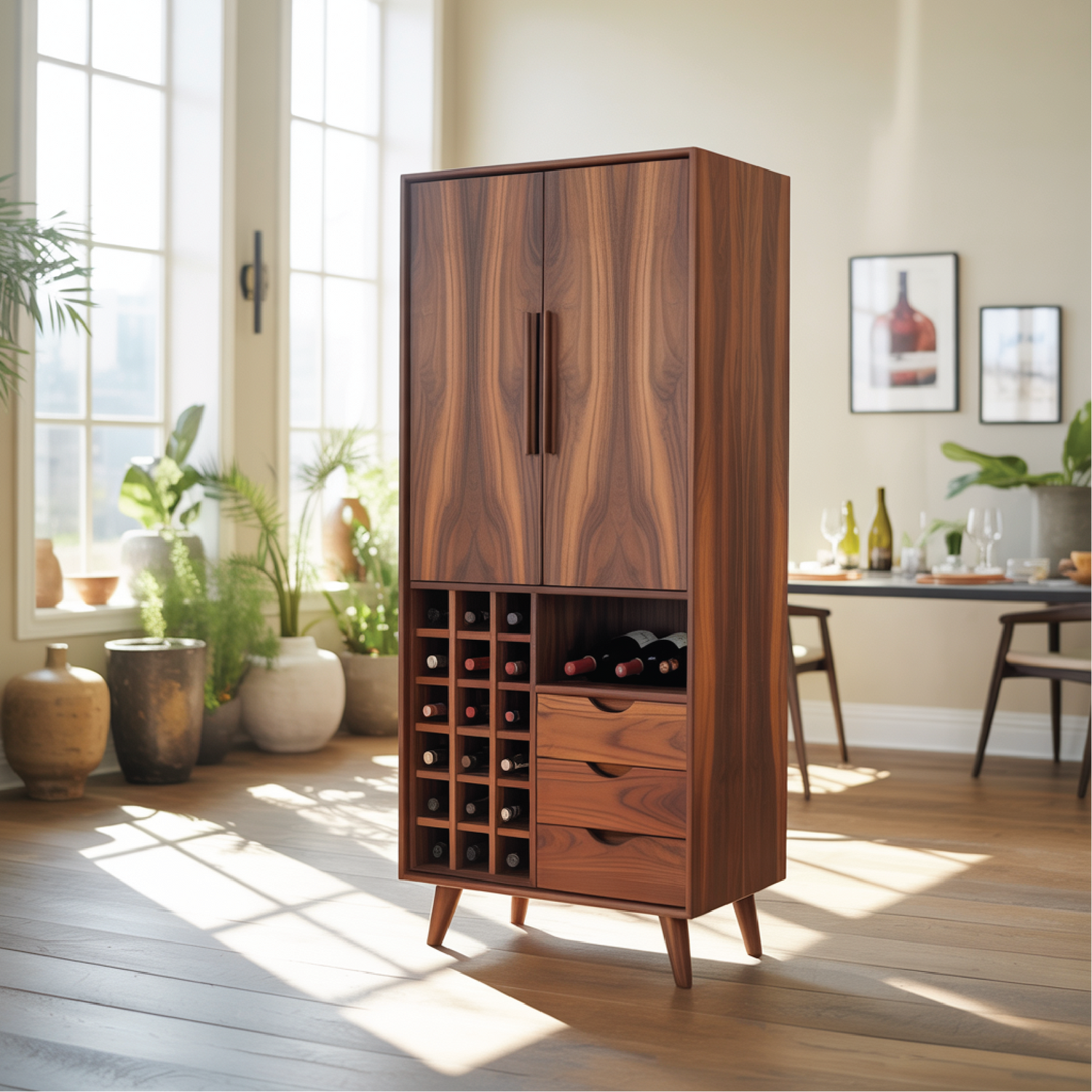 This handcrafted dining cabinet is made from solid wood with rich, natural grain patterns that bring warmth to any interior. The lower wine grid and open shelf offer organized storage for bottles and essentials, while the drawers keep smaller items neatly tucked away. Tall double doors provide spacious concealed storage, making it both elegant and highly functional.