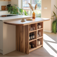 This handcrafted dining table features a smooth rounded-edge solid wood top that adds warmth and elegance to any kitchen. The built-in multi-shelf storage is perfect for organizing wine bottles, cups, and daily essentials. Its natural grain and minimalist design create a cozy, functional centerpiece for modern living spaces.