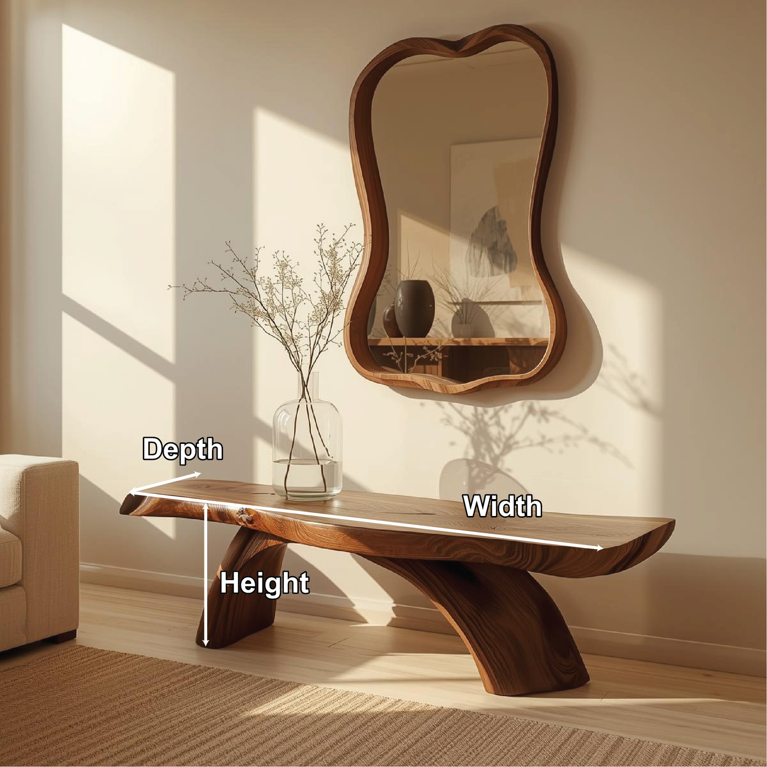 This handcrafted solid wood entryway bench showcases a stunning live edge top with gracefully curved legs. Each piece is uniquely shaped, emphasizing the natural grain and artistry of the wood. A perfect statement for contemporary or organic interiors, it brings warmth, balance, and timeless craftsmanship to any space.