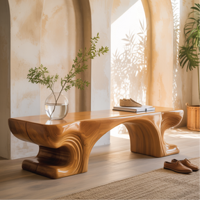 This entryway bench is crafted from solid wood and shaped into fluid, sculptural curves that bring natural elegance to any space. The polished surface enhances the wood’s grain, creating a luxurious and inviting focal point. Perfect for entryways, living areas, or serene corners, it blends artistic design with everyday functionality.