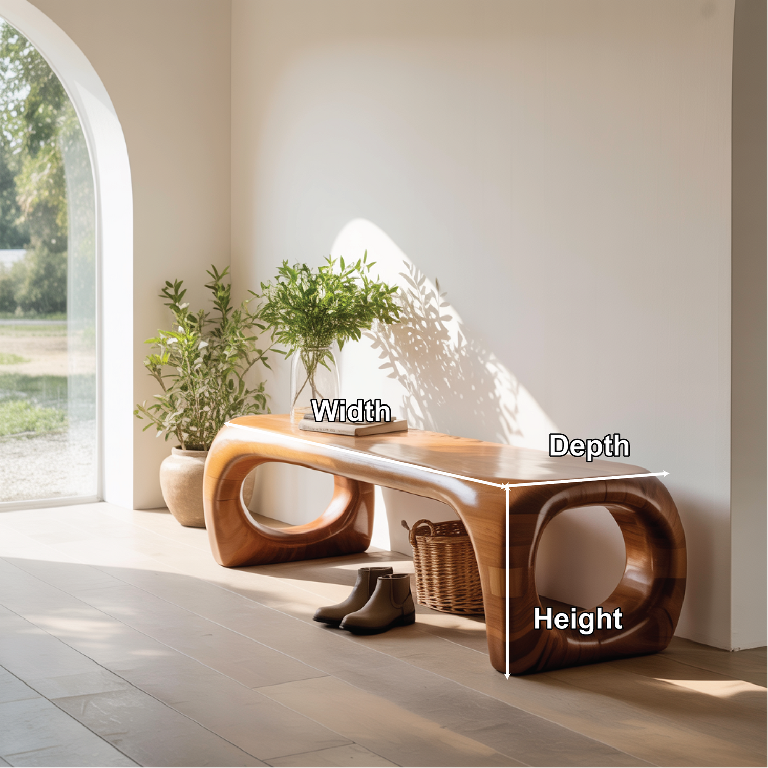 This entryway bench showcases a beautifully sculpted solid wood form with smooth, flowing curves and bold circular cutouts. Its hand-polished surface highlights the natural grain, bringing warmth and sophistication to any space. Perfect for foyers, hallways, or living areas, it blends functional seating with striking modern artistry.