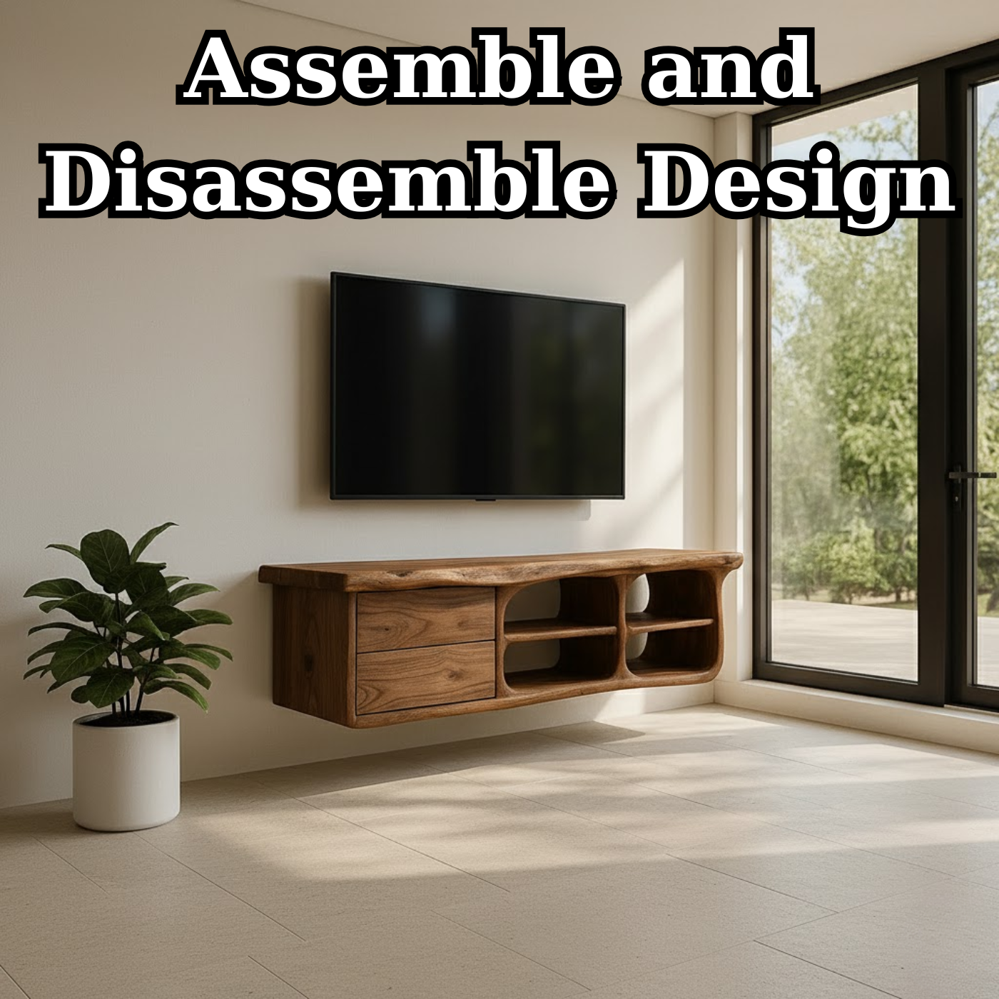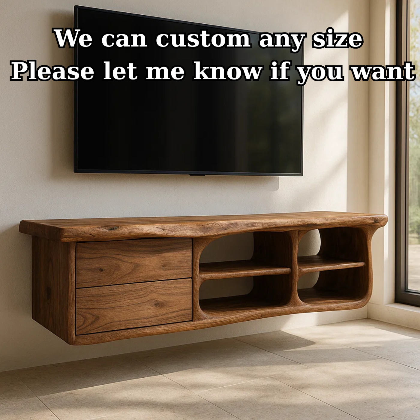 This handcrafted solid wood floating TV stand features a stunning live edge design that brings natural warmth and organic beauty into your living space. The smooth walnut finish enhances its rustic charm, while the curved open shelving and hidden drawers provide practical storage for media essentials. A perfect fusion of artisanal craftsmanship and modern minimalist style.