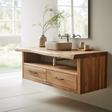 Elevate your modern bathroom with our handcrafted solid wood floating vanity, meticulously built from premium solid wood, this durable console features a stunning two-tier live edge design perfect for a vessel sink setup, and offers stylish, space-saving storage, seamlessly blending natural beauty with essential daily functionality.