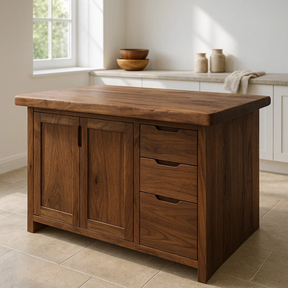 This Handcrafted Soild Wood Kitchen Island offers sophisticated storage with both cabinet space and deep drawers, perfect for a contemporary or transitional kitchen design. Built from premium solid wood, the island's rich finish and clean lines create a luxurious, durable, and highly functional centerpiece for any culinary space.
