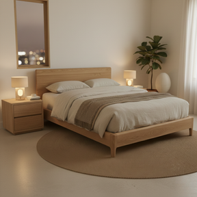 This handcrafted solid wood bed features a warm light-oak finish and a clean Japandi silhouette. The low profile frame, smooth rounded edges, and minimalist headboard create a calming, natural bedroom atmosphere. Built with durability and timeless simplicity for modern homes.