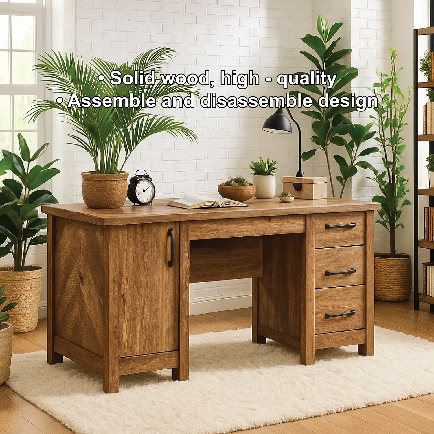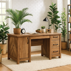 This handcrafted solid wood office desk combines rustic charm with modern functionality. Featuring multiple drawers and a smooth walnut finish, it offers both style and practicality. Perfect for home offices seeking a warm, organic aesthetic with durable craftsmanship.