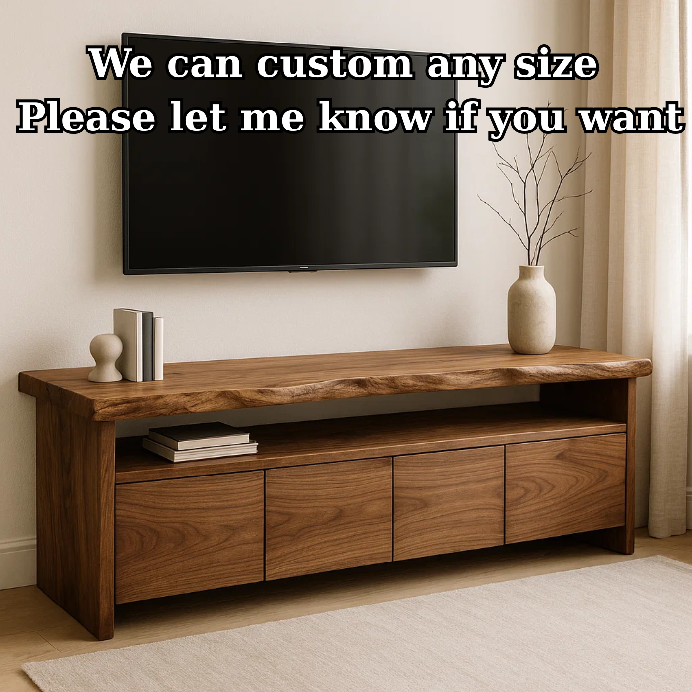 This handcrafted solid wood TV stand features a stunning live edge top that highlights the natural curves and grain of the wood. Built from premium hardwood, it includes three spacious drawers and an open shelf for clean, functional storage. With its smooth matte finish and warm walnut tone, this piece combines organic beauty with modern minimalism — perfect for living rooms that value timeless design and craftsmanship.