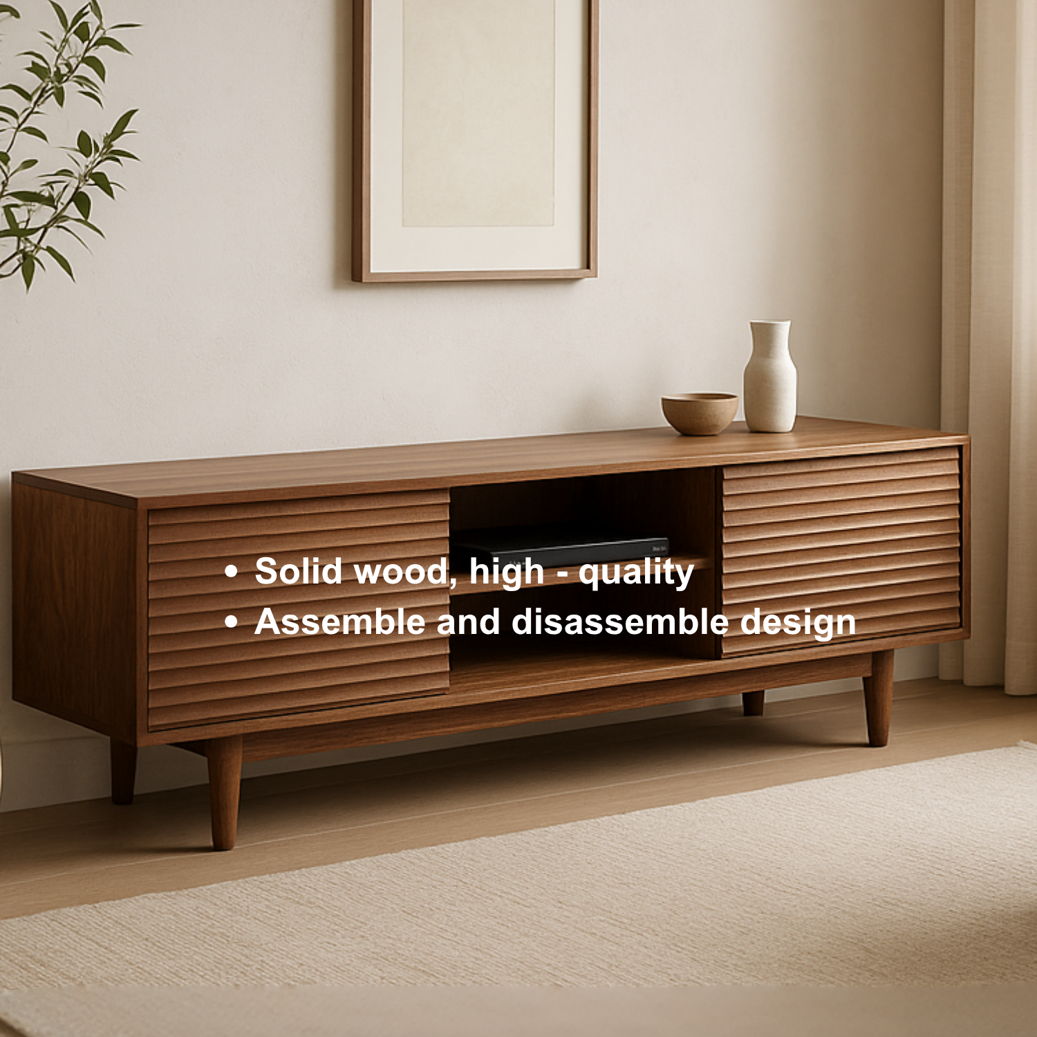 This handcrafted solid wood TV stand features ribbed sliding doors and a clean, minimalist silhouette.