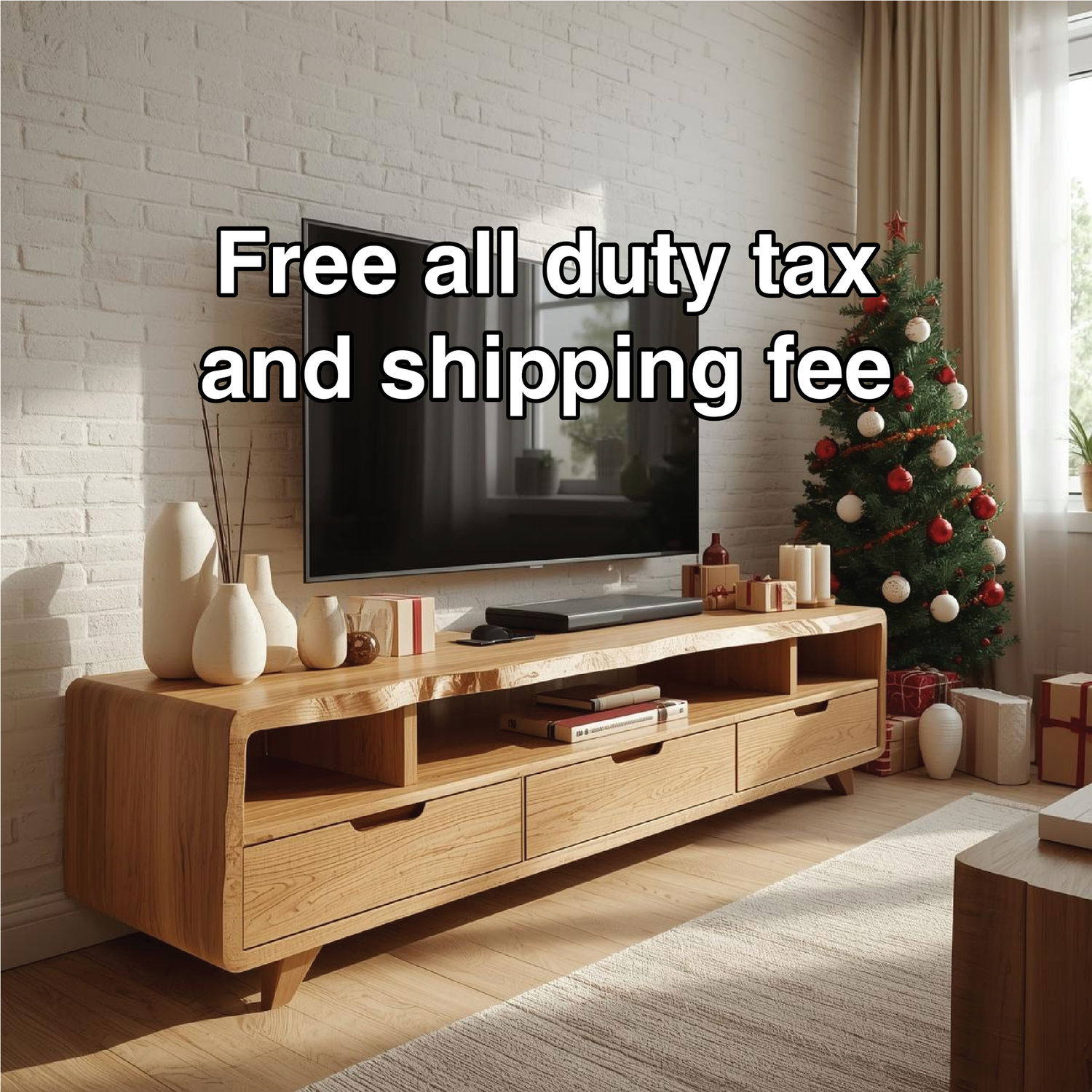 This handcrafted solid wood TV stand features smooth curved edges and a natural wood finish that enhances modern Scandinavian charm. Designed with open shelving and spacious drawers, it offers both functionality and minimalistic beauty. Perfect for festive or everyday setups, it adds warmth and sophistication to your living space.