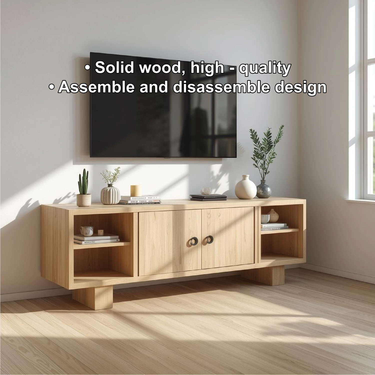 This handcrafted solid wood TV stand combines functionality with minimalist elegance. The double-door cabinet and open shelves offer generous storage for media and décor. Its natural oak tone and clean design bring warmth and balance to any modern living space.