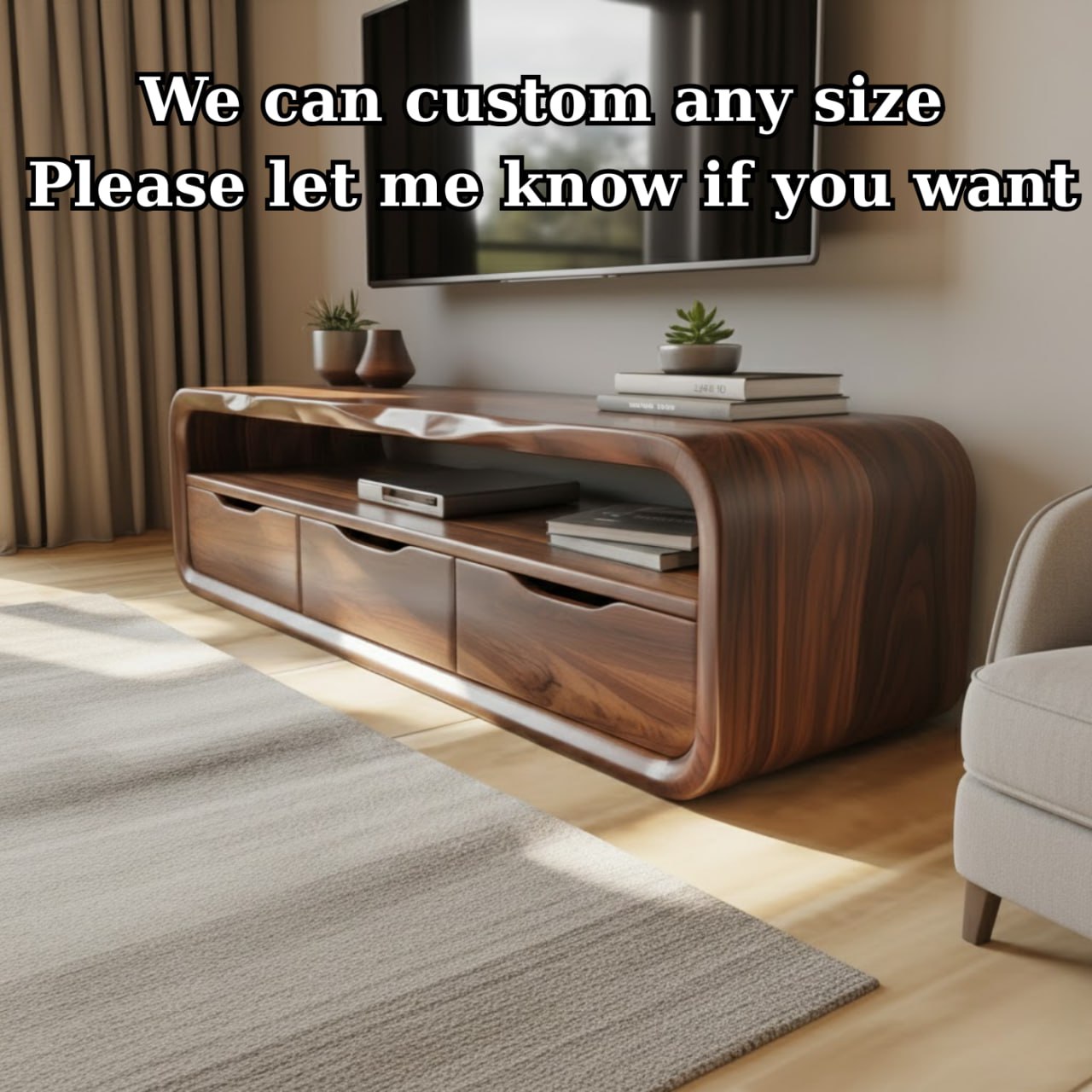 This handcrafted solid wood TV stand features elegant curved edges and a seamless, sculptural form that elevates any living space. Built with smooth drawers and an open shelf, it offers both stylish display space and practical storage for modern homes.