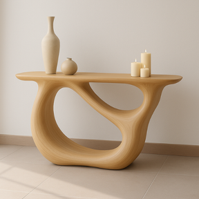 This handcrafted solid wood console table captures the essence of organic artistry with its smooth, continuous curves and light oak finish. The sculptural form creates a timeless statement piece, perfect for refined, minimalist interiors.