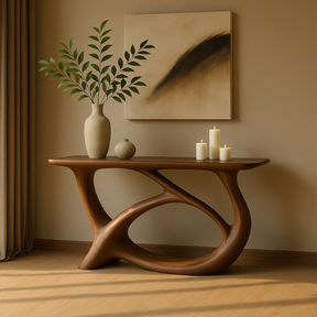 This handcrafted solid wood console table features a graceful flowcurve structure with smooth, sculptural lines. Blending natural artistry with modern simplicity, it brings warmth, elegance, and a sense of movement to contemporary interiors.
