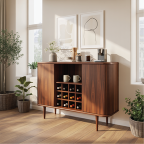 This solid wood wine storage cabinet features a central bottle rack and smooth sliding doors for convenient organization. Its warm grain patterns and curved mid-century lines add an elegant touch to any dining or living space. Designed for both wine lovers and modern interior enthusiasts, it provides functional storage with timeless style.